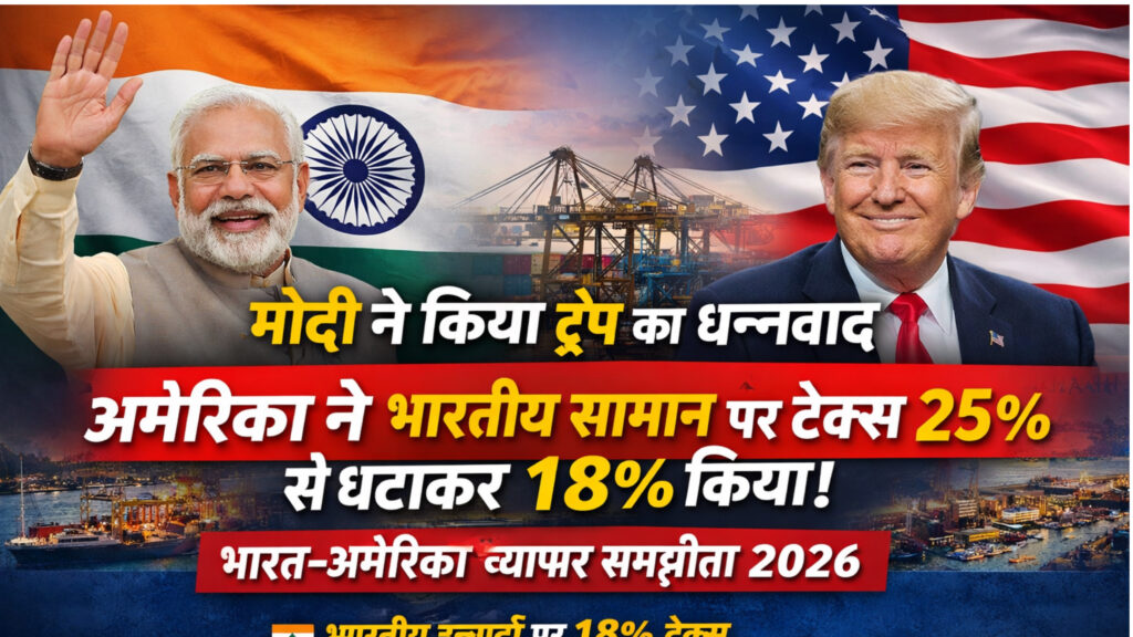 भारत और अमेरिका के बीच व्यापारिक रिश्तों में एक बड़ा और ऐतिहासिक मोड़ आया है। प्रधानमंत्री नरेंद्र मोदी और अमेरिका के पूर्व राष्ट्रपति डोनाल्ड ट्रंप के बीच हुई बातचीत के बाद दोनों देशों ने एक अहम व्यापार समझौते का ऐलान किया है। इस समझौते के तहत अमेरिका ने भारतीय वस्तुओं पर लगने वाले टैक्स (टैरिफ) को 25% से घटाकर 18% करने का फैसला लिया है।